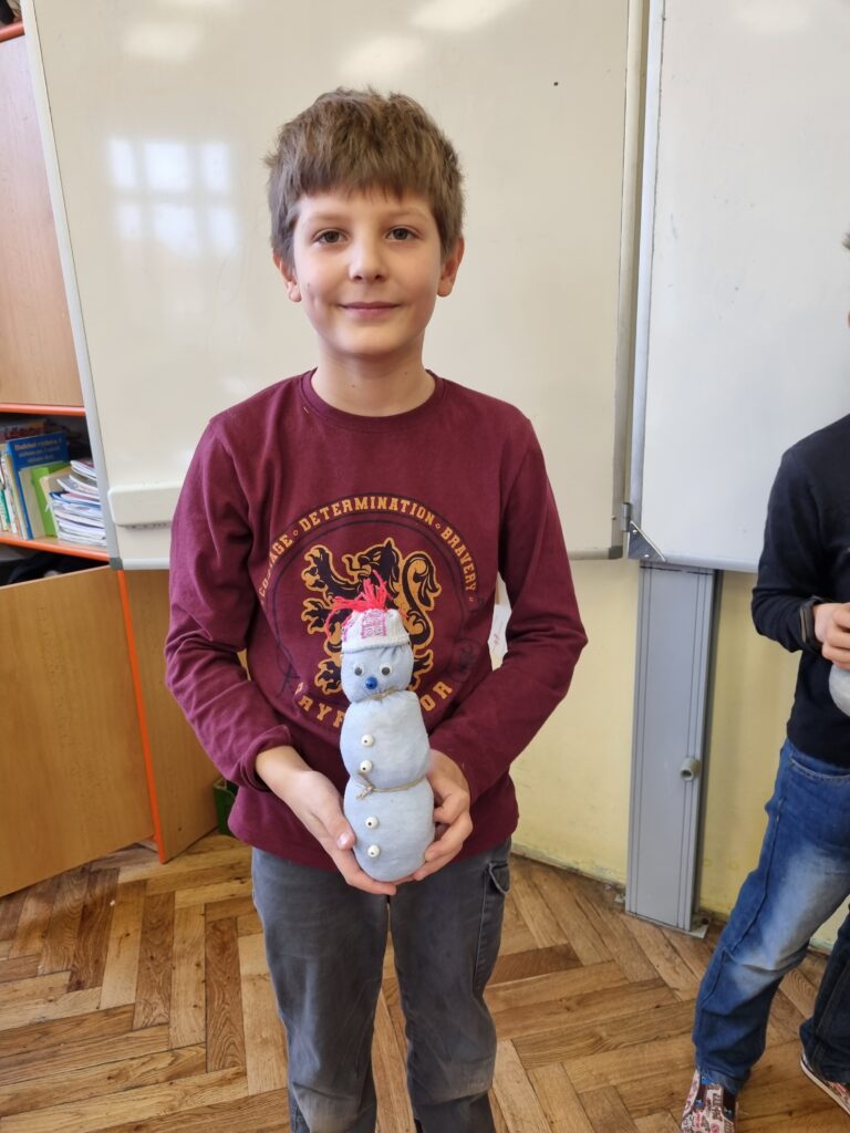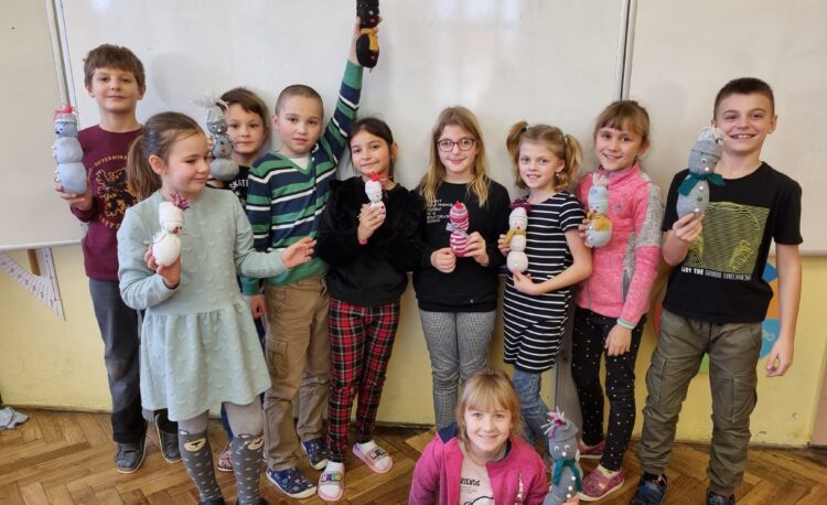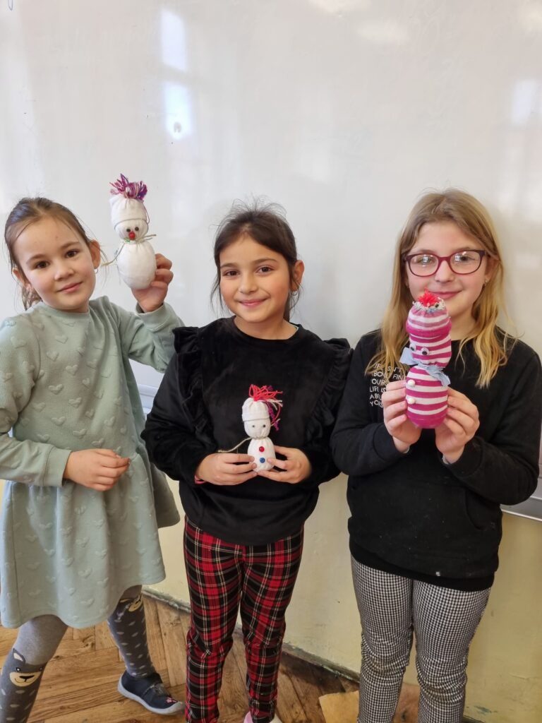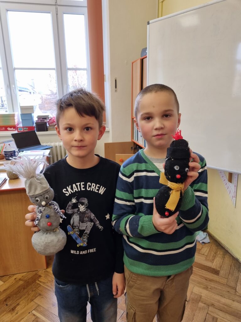 Není sníh? Nemůžeme stavět sněhuláky? Nevadí, při pracovních činnostech jsme si je vytvořili ze starých ponožek. A že se nám povedli.